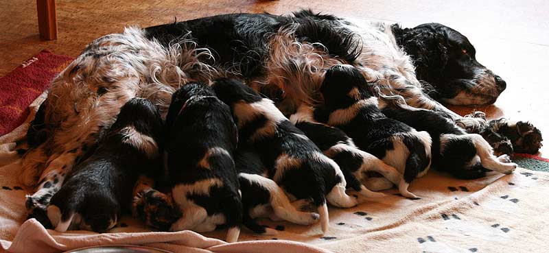 Over 8 uker på vei: Nå begynner det å bli tungt! Magen er stor og tung, så det begynner å bli tungt å gå trapper og å løpe. Det smaker heller ikke like godt med mat - bortsett fra den hun får servert fra bordet, da.... I dag har vi hatt "opprydding" og skrapt tannstein, klipt klør, renset ører og klipt poter. I morgen skal jeg klippe ferdig resten av hunden og bade ørene. De stinker gård.... Det gjelder å være ren og pen når man skal ha valper! |