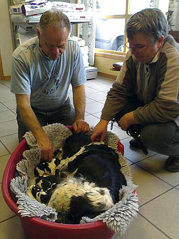 Kl. 24.00 kom første valpen - en bitte liten svart/hvit hannhund som kom bak fram og som jeg måtte jobbe litt med for å få i gang med å suge. Han hadde nok hatt det litt hardt, stakkars. Tynn var han også - men med livskraft så det gikk ikke lenge før han hang på spenen og ville ha MAT. Så kom de som perler på en snor. Til klokka 03.00 var 5 valper ute og Qandis hadde sterke gode rier slik at valpene bare poppet ut. Men etter nr. 5 sovnet hun - og det gjorde jeg også to timer. Da hadde vi oss en liten luftetur, hun drakk litt og jeg håpte på at de resterende også ville komme. Men da hun tok livet med ro bestemte vi oss for å gi litt oxytocin, kalk og glucose for å få ut de siste før det gikk for lang tid. Jeg tippet at det var totalt 7 valper. røntgenbildet vi tok viste at det var helt riktig - det var to igjen. Et par minutter etter oxytocinet var gitt poppet de to siste valpene ut uten andre problemer og vi kunne reise hjem igjen. Qandis er vel ganske utrolig som ikek stressa i hele tatt med at vi var på et helt ukjent sted der det luktet mye rart. Godt med slike tisper! På bildet er veterinær Gunnar og jeg med en kurv full av vakre små godbiter. |