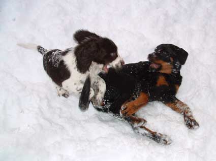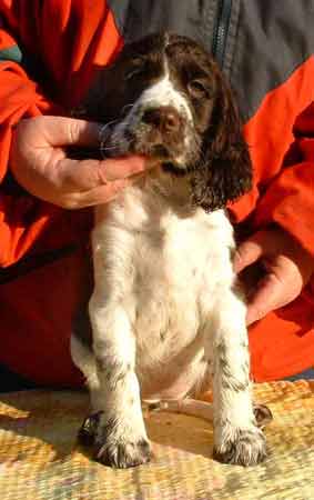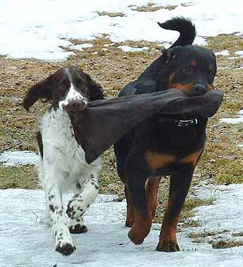 3 måneder gammel ble jeg bitt av en malamute - men heldigvis fikk jeg en lekekompis som heter Sutty. | Her har jeg blitt 3 måneder gammel og vi trener på oppstilling. |
