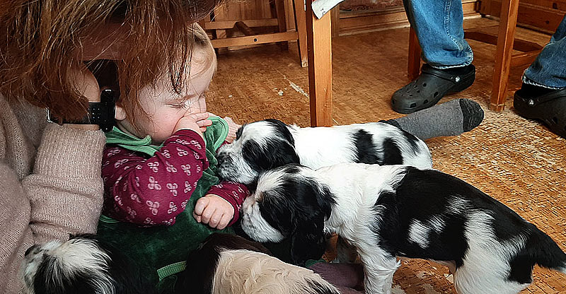 gulvet med valpene. Ennå ammer valpene, men de spiser 3-4 måltider