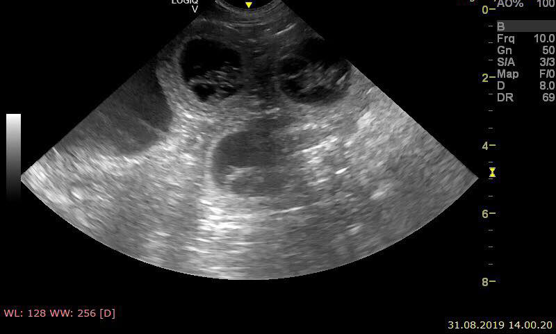 Den førstfødte tispa har stor mage og har det ikkje bra. Eg