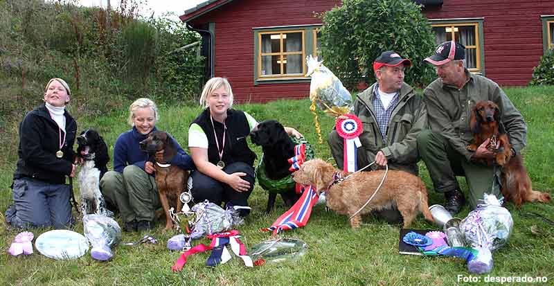 Årets NM-vinnere. Fra venstre Elin Anita Gjerde, Leikanger, med NVCH Desperados Tingeling som ble beste spaniel, beste hund under 7 år og nr. 5 totalt. 14 år gamle Ina Sandal med NSJCH NVCH Balder som ble nr. 2 og beste fører under 23 år. NM-vinner 07 Anne Katrin Bøyum med NSVCH Svegro's Tasha, Kjell Erlev med NVCH Åstdalen's Sørlands Terna som ble nr. 3 og vant premien til mest spesielle hendelse i sporet og beste fører over 50 år. Lengst til høyre Asbjørn Tømmernes med NVCH Cazador del Ciervo som ble nr. 7 totalt og beste dachs.
