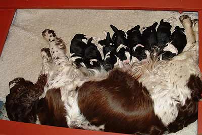 ![]() Selv om det nå er noe størrelsesforskjell mellom største og minste valpen så er det fremdeles et meget jevnt kull med 8 livskraftige valper. Jeg har nå begynt å gi litt tillegg til de minste valpene for å prøve å jevne ut forskjellen. Noen av valpene har så vidt begynt å løfte seg litt opp på beina når de leter etter mat - men de er fremdeles blinde og døve. Jeg klarer knapt å si hvem som er hvem på bildet! |