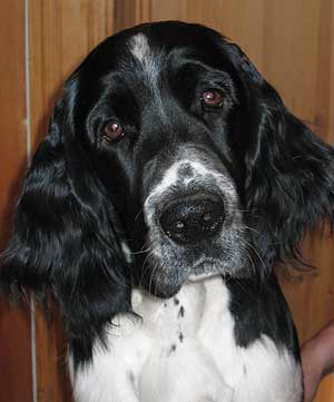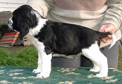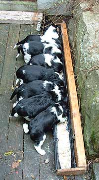 61 dagen Kl. 20.40 Odessa er sliten - men etter en tur rundt gården kom det en valp til. En svart hann (har spesialisert meg på det!)... Nå kan det være tomt, men er ikke sikker... Kl. 18.40 7 valper - 5 hanner og 2 tisper, alle svart hvite 17.45 kom valpen som både Odessa og vi sleit fælt med å få ut. Vannet hadde gått for en time siden, men valpen ville ikke ut. Til slutt måtte vi "fiske" ut valpen - det var en svart hann på 500 g. Vekta har han ikke fordi han er så diger, men fordi den av en eller annen grunn er veskefylt. Veterinær er kontaktet og han sier at den kan bli en helt normal valp. Det kan være navlestrengen som har ligget feil. Den ser helt normal ut ellers. Tilstanden heter anasarca og denne valpen har en meget mild grad. Nå skal den masseres mye og oppfordres til å tisse så mye som mulig. 18.30 plumpa det uten problemer ut en ny svart hann på 400 g. Og tomt tror vi ikke det er ennå - men nå minker det. Kl. 15.25 - nå er det fem valper. Svart tispe på 420 g kom 14.40. Svart hann på 400 g kl. 15.00 og svart hann på 420 g kl. 15.20. Det virker nå som om Ove kan være dominant svart. Nå håper vi at vi har kommet halvveis! Kl. 14.00 2 valper født Første, en svart tispe på 400 g, kom 12.20, den andre, en svart hann på 430 g, ville ikke ut før klokka 13.55. Odessa jobba hardt med han så vi er bekymret for at hun blir utslitt før sistemann er ute... kl. 08.30. Temp 36.8. Det har vært en urolig natt. Odessa har hatt oppblokking i hele natt. Pesa, vært rastløs, gravet i kassa m.m. Hun og jeg har sovet på kontoret/valperommet sammen. I løpet av dagen burde første valpen være her. Ser ut som om hun følger samme skjema som på R-kullet. Har spist noen ostebiter - ellers ingen apetitt. 22 august 60. dagen og ting på gang. Temperaturen har vært nede i 37.1 og Odessa vil ikke ha mat.... 20 august Bakkeklaringen begynner å bli faretruende liten!!! På 8 uker var Odessa 83 cm i livmål - det er MYE. Nå har alt seget ned slik at hun knapt kan gå.. Selv om det ikke lenger er så varmt ute, begynner det å ta på Odessa å gå med så mange valper. Appetitten er ikke på topp, hun vil ikke gå tur lenger, ligger stort sett og stønner og sukker... Ikke rart - hun er vel 10 kg over en normalvekt på noe over 20 kg.... 16 august I varmen er det tungt å være så diger. På lørdag fikk derfor Odessa badet seg. Både for å bli ren og for å kjøle seg ned. Det er slutt på å være med de andre hundene å gå tur, men hun fikk være med på Karens hytte der det er bilvei frem og fint å være både for tobeinte og firbeinte. Nå siste uka blir det små rusleturer i Odessas eget tempo. Godt det har blitt kjøligere i været for hun blir raskt veldig varm. 13 august og over 7 uker på